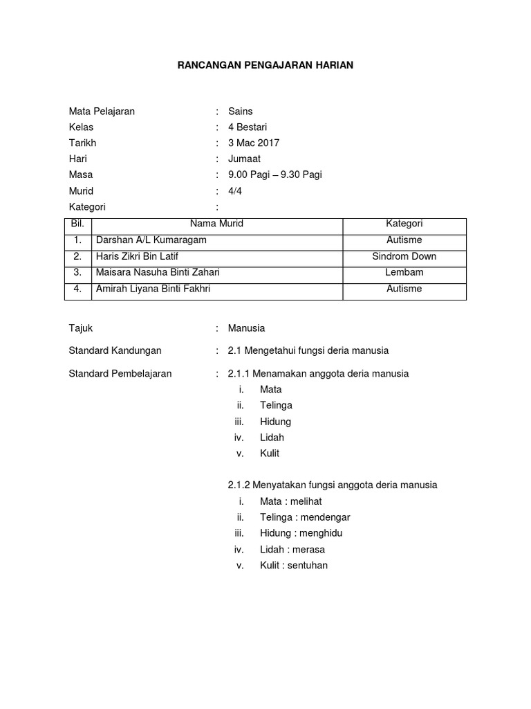 SPEMBELAJARAN 511 Memerihalkan pelbagai sumber tenaga seperti Matahari angin air ombak makanan bateri biojisim nuklear dan. Rancangan Pengajaran Harian Aqidah. Memahami organ deria dan fungsinya Hasil pembelajaran.
